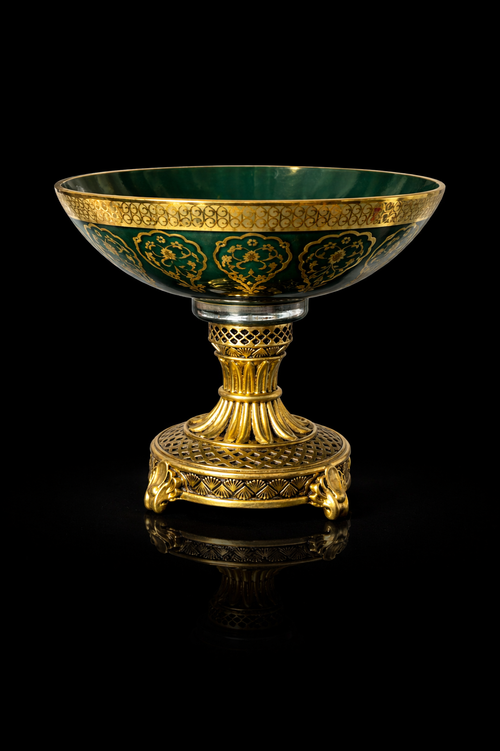 El işçiliği ile üretilmiş lüks ayaklı servis kasesi, altın varak desenleri ve parlak yüzeyiyle bulunduğu ortama güçlü bir şıklık katar. Hem dekoratif amaçlı hem sunum amaçlı kullanılabilir. Masaüstünde, vitrinde, konsolda veya özel davetlerde dikkat çeker.