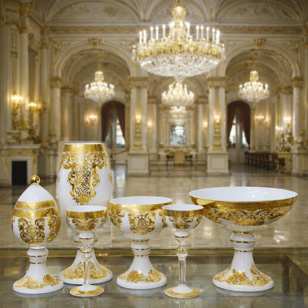 Zarif tasarımı ve el işçiliği detaylarıyla öne çıkan kristalize üfleme cam konsol takımı, yaşam alanlarınıza lüks ve ihtişam katmak için özel olarak üretilmiştir. Şeffaf cam üzerine uygulanan altın yaldız desenler, ürüne göz alıcı ve sofistike bir görünüm kazandırır.