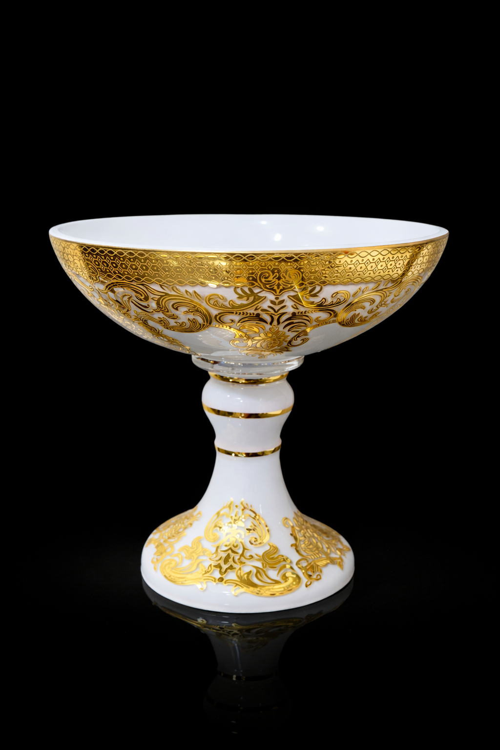 El işçiliği ile üretilmiş lüks ayaklı servis kasesi, altın varak desenleri ve parlak yüzeyiyle bulunduğu ortama güçlü bir şıklık katar. Hem dekoratif amaçlı hem sunum amaçlı kullanılabilir. Masaüstünde, vitrinde, konsolda veya özel davetlerde dikkat çeker.