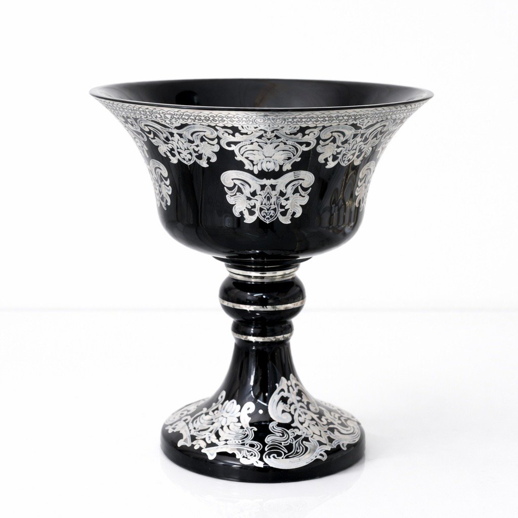 El işçiliği ile üretilmiş lüks ayaklı servis kasesi, gümüş varak desenleri ve parlak yüzeyiyle bulunduğu ortama güçlü bir şıklık katar. Hem dekoratif amaçlı hem sunum amaçlı kullanılabilir. Masaüstünde, vitrinde, konsolda veya özel davetlerde dikkat çeker.